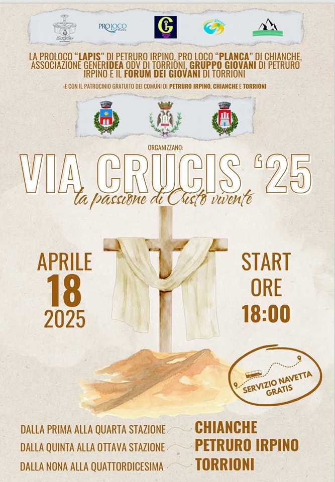 On 18 April 2025, the villages of Chianche, Petruro Irpino and Torrioni will be the protagonists of a touching and spiritually rich event: the "Via Crucis '25 - The Passion of the Living Christ". The initiative, promoted by the Pro Loco "Lapis" of Petruro Irpino, "Planca" of Chianche, and with the participation of the Generidea ODV association of Torrioni, the Youth Group of Petruro Irpino and the Youth Forum of Torrioni, will take place under the patronage of the three Municipalities involved.