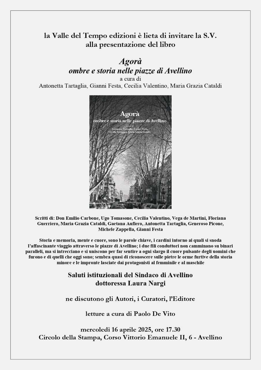 Mercoledì 16 aprile, alle 17.30, “Agorà” sarà presentato al Circolo della stampa. A portare i propri saluti il sindaco Laura Nargi, gli autori e i curatori. Le letture saranno a cura di Paolo De Vito.