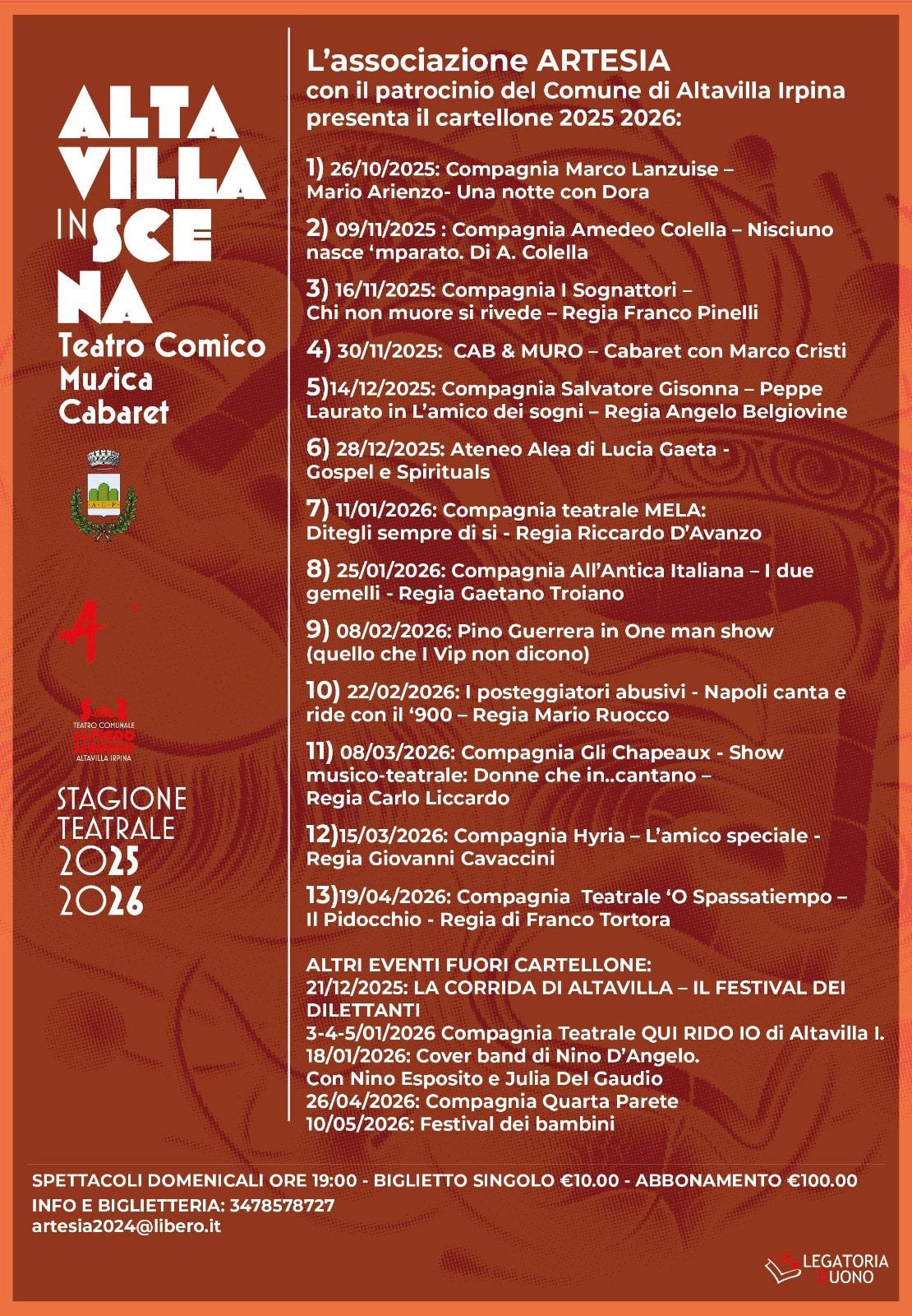 L’Associazione Artesia, con il patrocinio del Comune di Altavilla Irpina, presenta il cartellone teatrale “Altavilla in Scena 2025/2026”, un ricco programma che unisce teatro comico, musica e cabaret. Gli spettacoli, in scena al Teatro Comunale, si svolgeranno la domenica alle ore 19:00, dal 26 ottobre 2025 al 19 aprile 2026.
