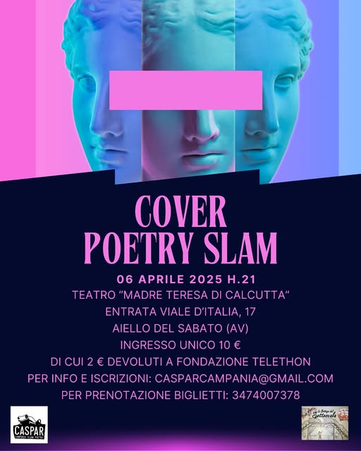 L'evento "Cover Poetry Slam" si terrà domenica 6 aprile alle 21:00 al Teatro "Madre Teresa di Calcutta" di Aiello del Sabato.