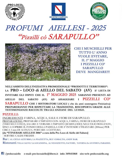 Giovedì 1 maggio, come da tradizione ad Aiello del Sabato ci si riunisce per la consueta passeggiata "Alla ricerca del sarapullo", erba spontanea che caratterizza i tradizionali "pizzilli" gustose frittelle che enfatizzano il suo aroma.