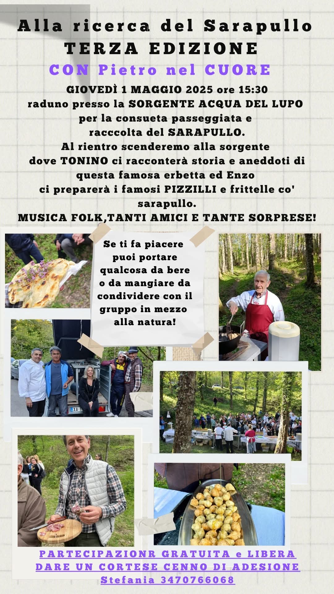 La passeggiata "Alla ricerca del sarapullo" edizione n.3, partirà alle ore 15:30 presso la Sorgente acqua del lupo in compagnia di Tonino, uomo del posto che farà da Cicerone raccontando storie ed aneddoti dell'erbetta, mentre Enzo preparerà i tipici pizzilli, musica folk intratterrà il pasto condiviso e frugale in mezzo alla natura.