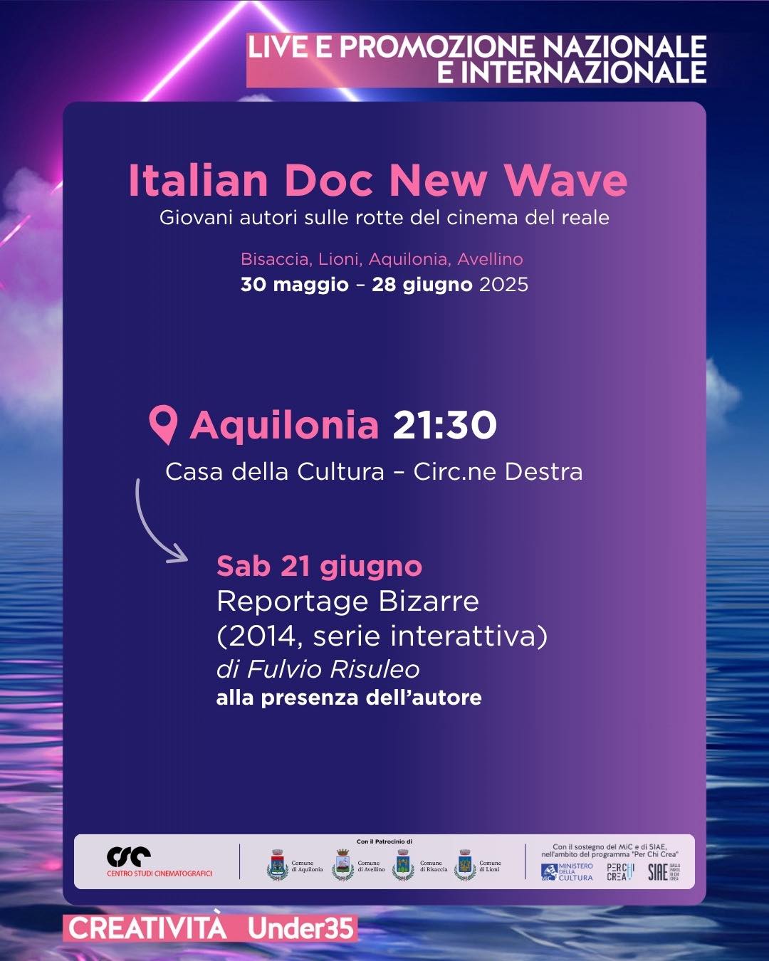 Il Comune di Aquilonia si fa promotore della cultura cinematografica giovanile ospitando una delle tappe dell'iniziativa "Italian Doc New Wave – Giovani autori sulle rotte del cinema del reale", rassegna dedicata ai talenti emergenti del documentario italiano. L’evento, patrocinato dal Ministero della Cultura e da SIAE nell’ambito del programma “Per Chi Crea”, vedrà protagonista la proiezione della serie interattiva "Reportage Bizarre” del regista Fulvio Risuleo.