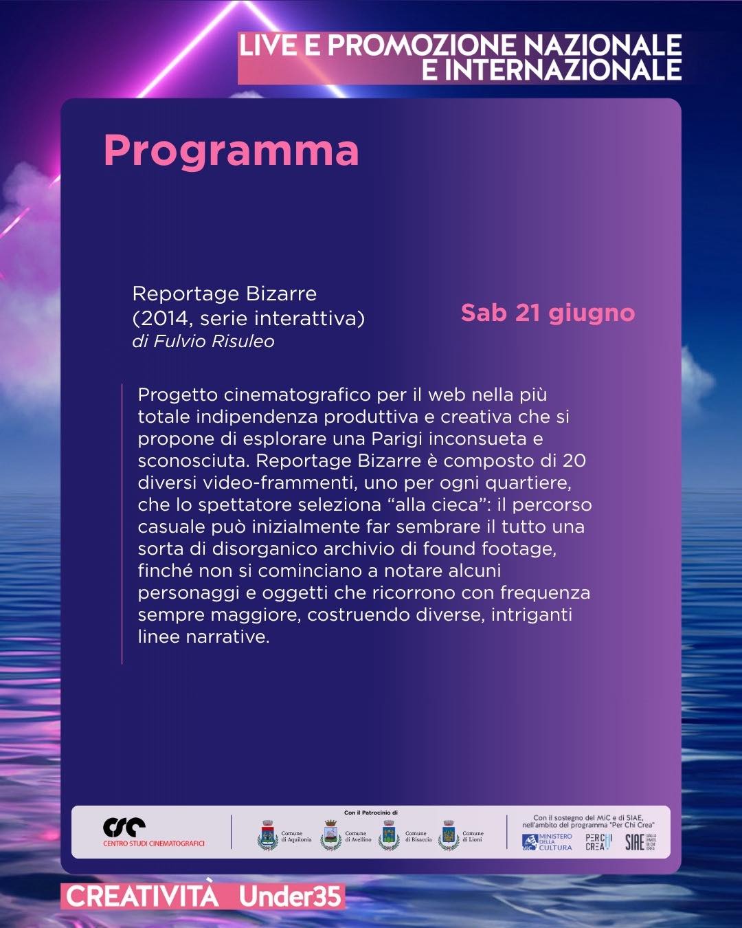 Il progetto, curato dal Centro Studi Cinematografici, si propone di valorizzare la creatività under 35, puntando su forme innovative di narrazione e su una promozione culturale capillare nei territori meno battuti dai circuiti tradizionali. “Reportage Bizarre”, realizzato nel 2014, è un’opera pensata per il web e strutturata in forma di serie interattiva: venti frammenti video ambientati in diversi quartieri di Parigi, che lo spettatore può selezionare casualmente. Questo approccio dà vita a un percorso narrativo dinamico, che inizialmente appare disorganico ma che, con il tempo, rivela fili conduttori ricorrenti, personaggi enigmatici e oggetti simbolici, creando trame sempre più affascinanti.