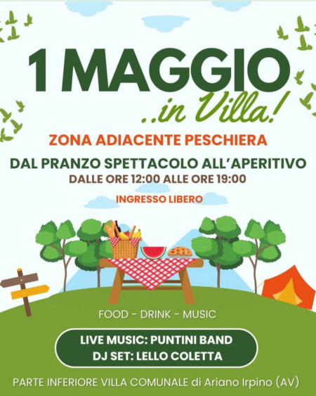 Ad Ariano Irpino si festeggia il "1 Maggio..in Villa". Dal pranzo spettacolo all'aperitivo, dalle ore 12.00 alle ore 19.00. Food, drink e music nella parte inferiore della Villa Comunale, in zona adiacente Peschiera. La festa dei lavoratori celebrata all'insegna del divertimento. Sarà il pranzo a dar via all'evento, allietato dalla performance musicale di "Puntini band". Nel pomeriggio sarà la volta del dj set Lello Coletta, nello scenario suggestivo della Villa Comunale si potrà ballare e condividere momenti di pura spensieratezza. Il pranzo avrà come punto di riferimento una zona ristoro, la location offrirà il resto: aria salubre, verde e sedute dislocate per godere della bontà del cibo.
