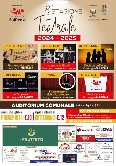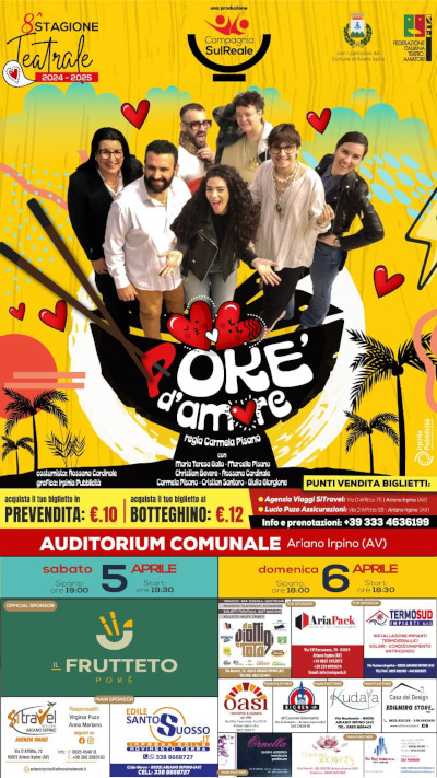 L'ottava stagione teatrale della Compagnia SulReale terminerà Domenica 6 Aprile con il sesto spettacolo in Cartellone. Ad Ariano Irpino spazio alla commedia brillante "Poke d'Amore" presso l'Auditorium Comunale "Lina Wertmüller". Doppio appuntamento nel week end: il primo Sabato 5 Aprile alle ore 19.30 e il secondo Domenica 6 Aprile alle ore 18.30.