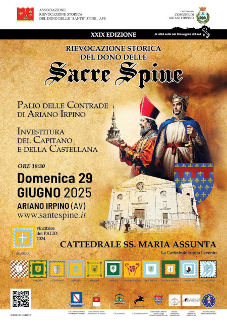 Domenica 29 Giugno alle 18:30, ad Ariano Irpino, presso la Cattedrale di Santa Maria Assunta, inizia il cammino verso la XXIX edizione della Rievocazione Storica del Dono delle Sante Spine che si terrà, come da tradizione, l'11, 12 e 13 Agosto. Cerimonia solenne di investitura del Capitano e della Castellana.