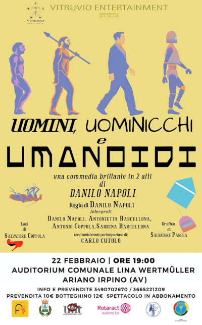 Terzo spettacolo del Cartellone "Be Different" ad opera della Compagnia "La Fermata" di Ariano Irpino. Sabato 22 Febbraio, alle ore 19.00, nella città del Tricolle, presso l'Auditorium Comunale "Lina Wertmüller", andrà in scena "Uomini, Uominicchi e Umanoidi". Commedia brillante in due atti, prodotta da Vitruvio Entertainment.