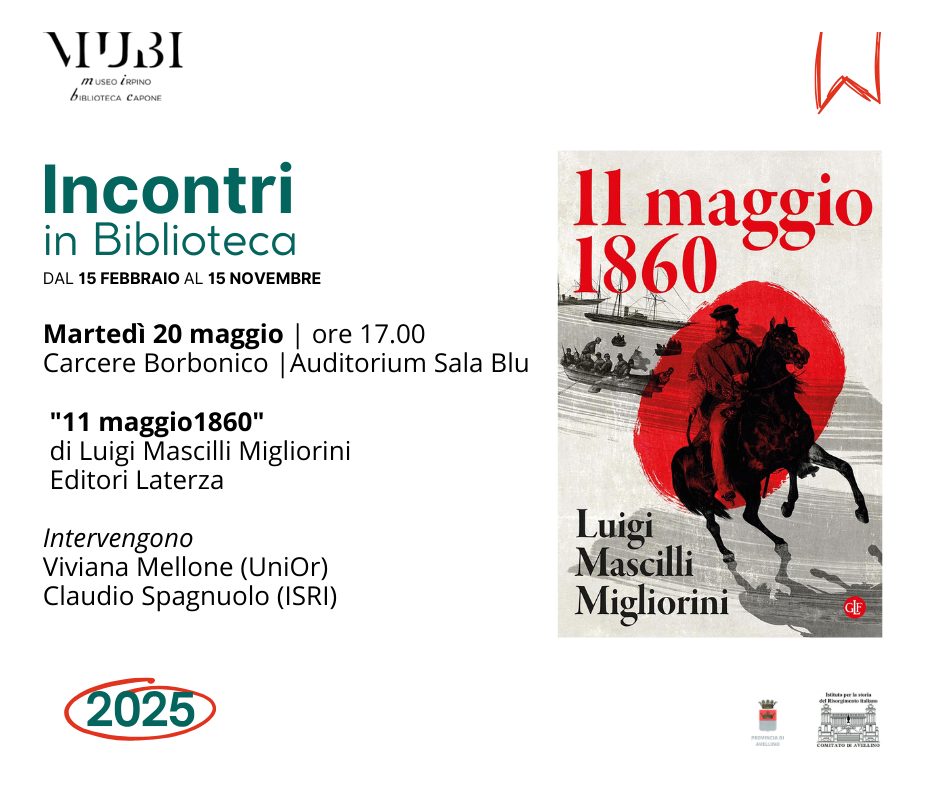 Continuano gli appuntamenti di Incontri in Biblioteca, martedì 20 maggio alle ore 17:00 presso la Sala Blu del Carcere Borbonico, il professore Luigi Mascilli Migliorini presenta "11 maggio 1860".