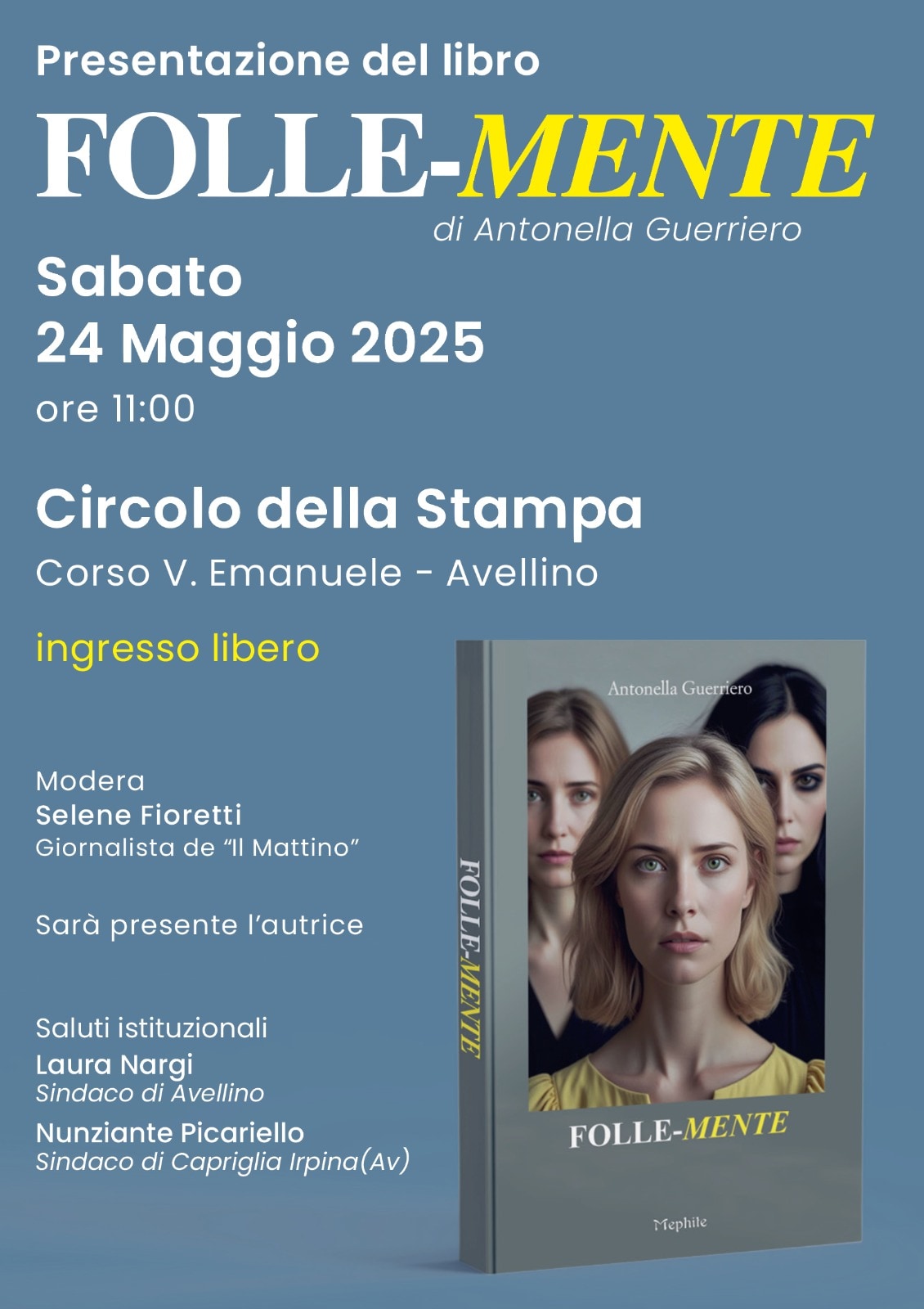 Sabato 24 maggio, al Circolo della stampa la presentazione del libro "Folle-mente" di Antonella Guerriero, un'opera audace e penetrante che esplora le complessità e i conflitti della psiche umana.
