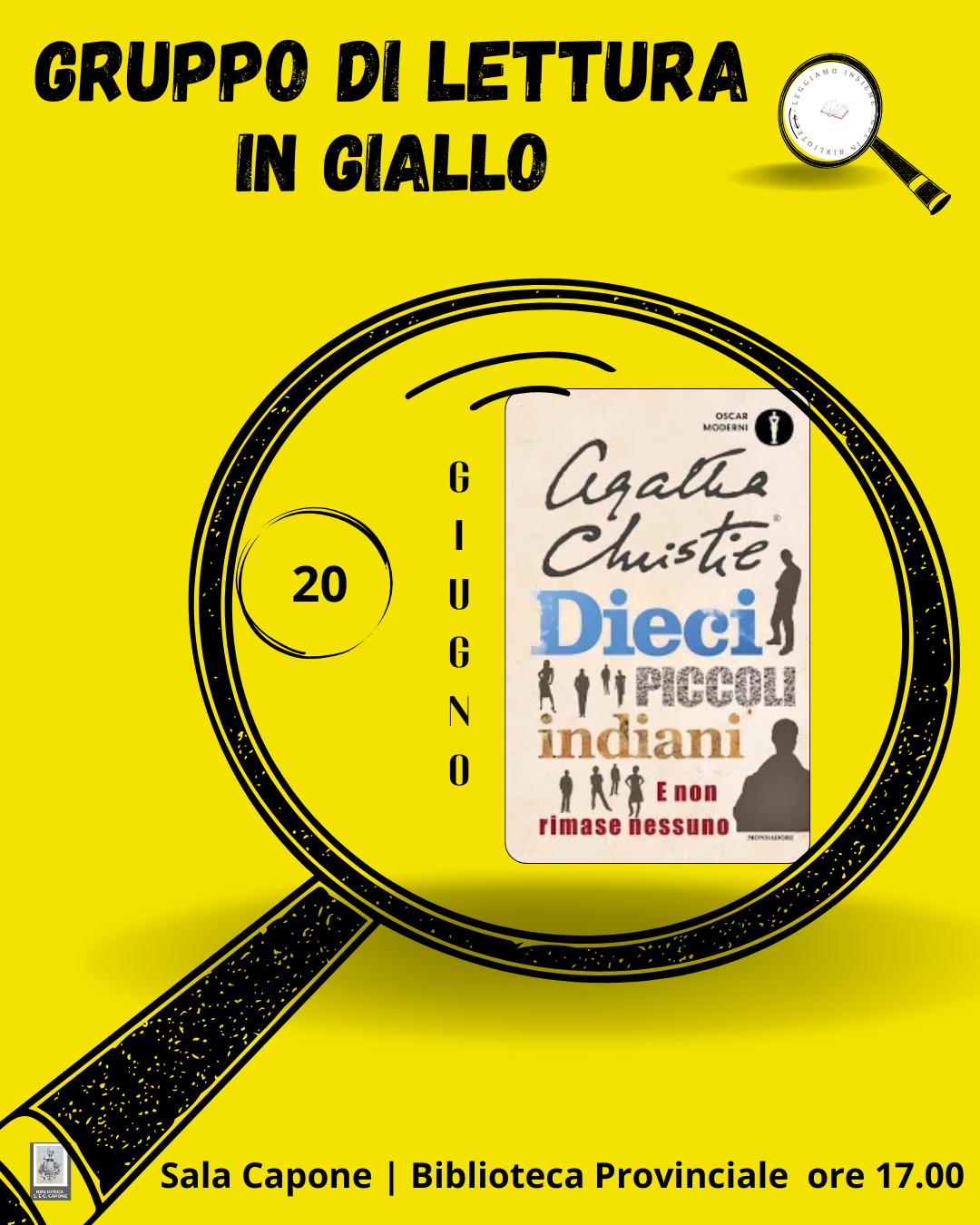 Venerdì 20 giugno alle ore 17:00 il gruppo di lettura dedicato ai libri gialli e noir si incontrerà nella Sala Capone per confrontarsi sul libro "Dieci piccoli indiani" di Agatha Christie.