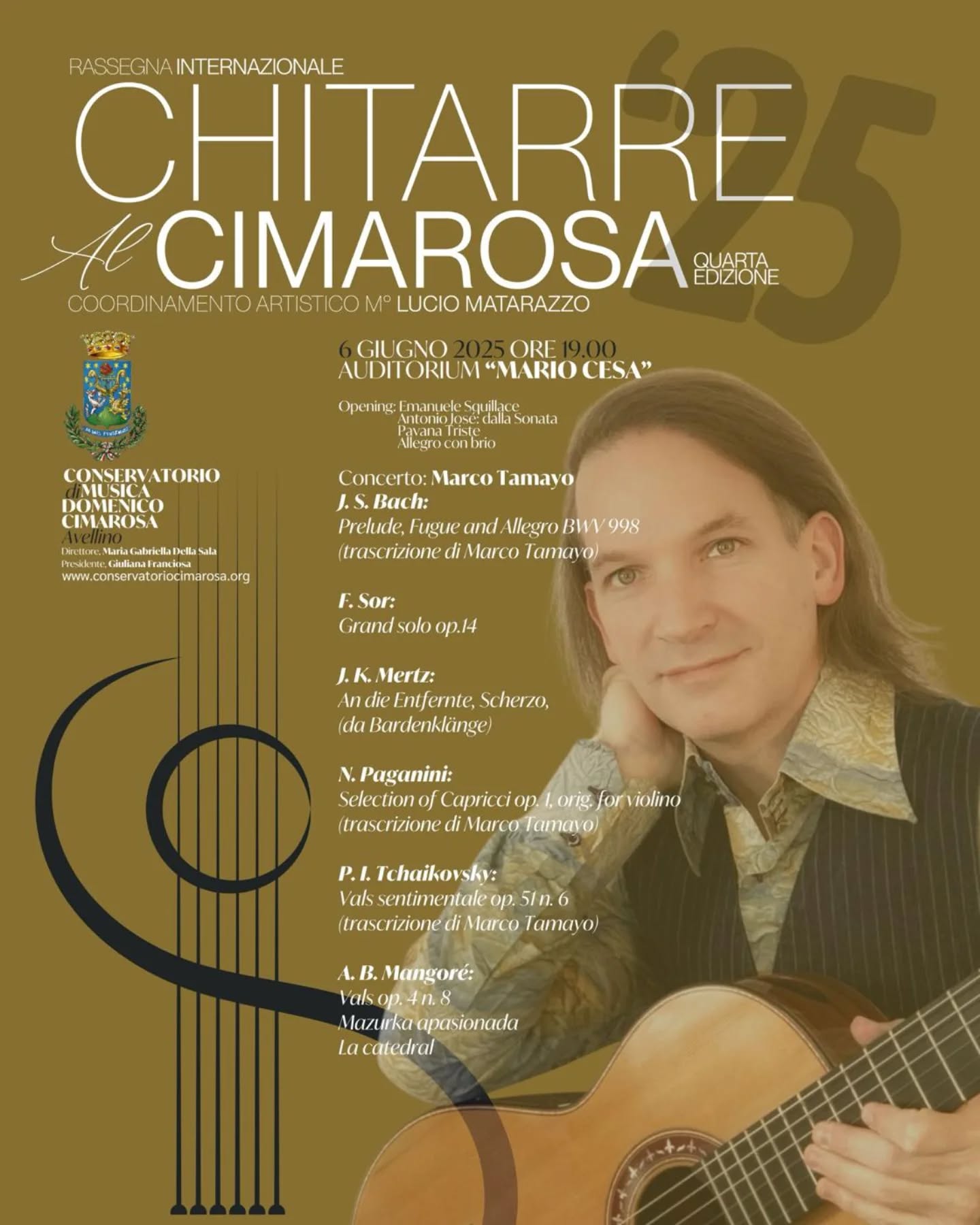 Protagonista della serata sarà Marco Tamayo, leggenda della chitarra classica, con un programma d’eccezione che attraversa secoli e stili: da J.S. Bach a Paganini, da Tchaikovsky a Mangoré, in un viaggio virtuosistico tra trascrizioni originali e grandi capolavori per chitarra.