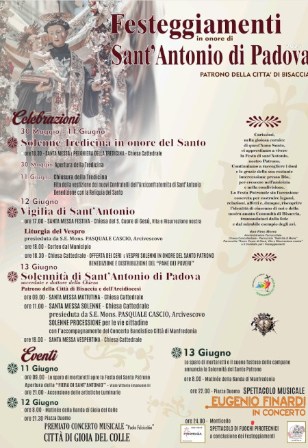Bisaccia si prepara a festeggiare il patrono Sant'Antonio di Padova. Celebrazioni religiose ed eventi ad arricchire la tre giorni nel paese dell'Irpinia d'Oriente. Il clou, per quanto riguarda il programma civile, sarà lo spettacolo di Eugenio Finardi, incentrato sul suo nuovo album "Tutto". Con la "Fiera di Sant'Antonio" ad aprire i festeggiamenti, non mancheranno le luminarie e, Giovedì 12 Giugno, il Premiato Concerto Musicale "Paolo Falcicchio", Città di Gioia del Colle.