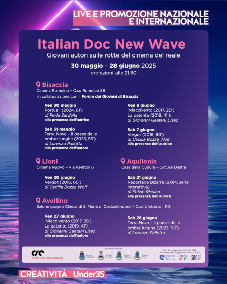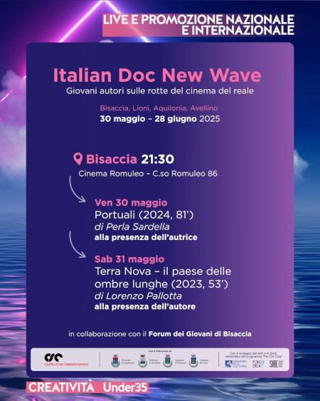 Al via la rassegna Italian Doc New Wave, giovani autori sulle rotte del cinema reale. Sarà Bisaccia a ospitare i primi quattro appuntamenti. Venerdì 30 e Sabato 31 Maggio "Portuali" di Perla Sardella e "Terra Nova - il paese delle ombre lunghe" di Lorenzo Pallotta. Ci si ritroverà al Cinema Romuleo in Corso Romuleo 86 alle ore 21.30. Le due prossime proiezioni, nel paese dell'Irpinia d'Oriente, nei giorni di Venerdì 6 e Sabato 7 Giugno.