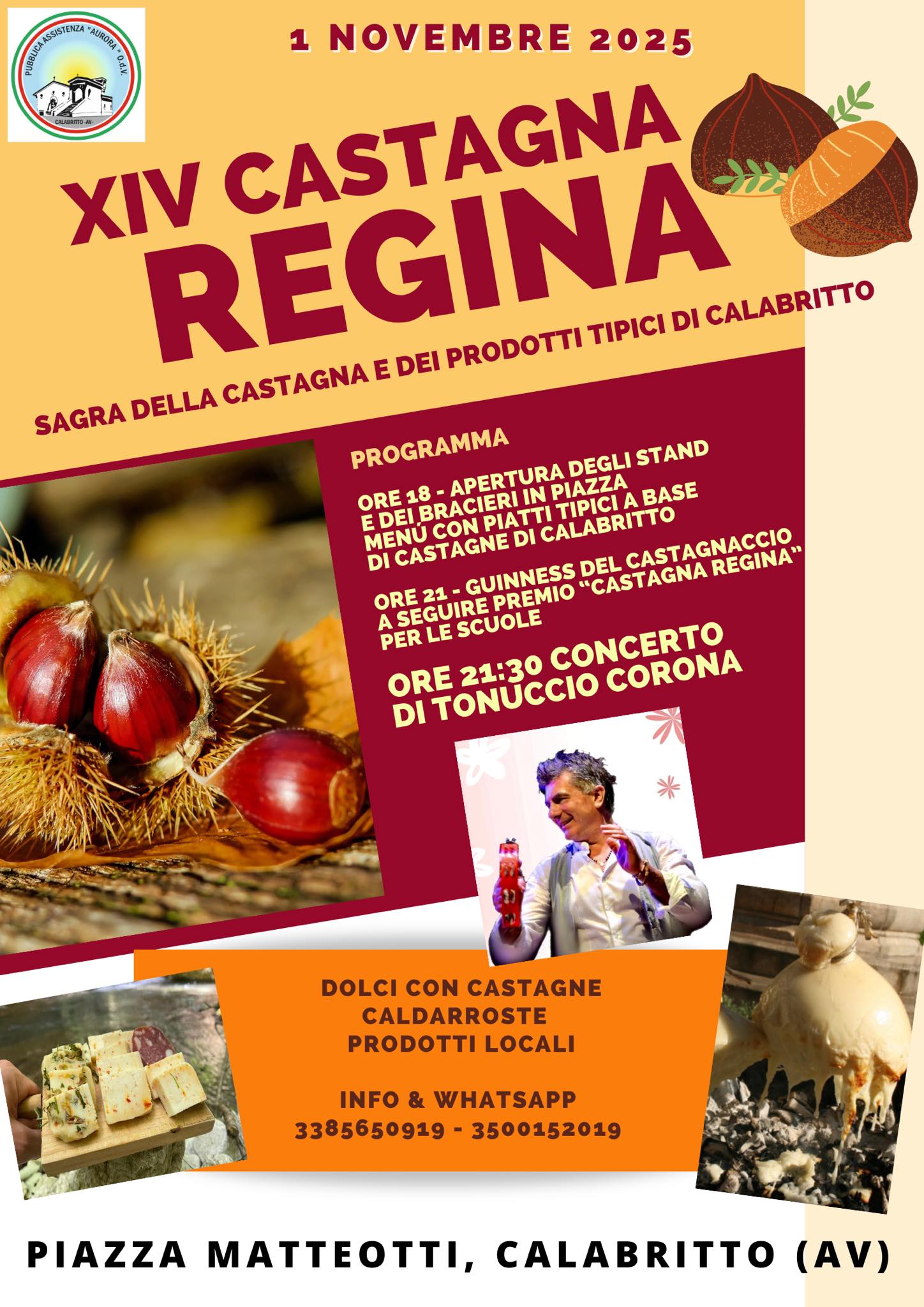 Il prossimo 1° novembre, la suggestiva Piazza Matteotti di Calabritto tornerà ad animarsi con la XIV edizione della “Castagna Regina”, la sagra dedicata alla castagna e ai prodotti tipici del territorio. L’evento, organizzato dalla Pubblica Assistenza “Aurora”, rappresenta ormai un appuntamento imperdibile per gli amanti della buona cucina e delle tradizioni irpine.