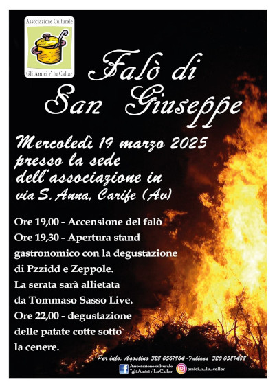 Carife si prepara ad abbracciare una delle sue tradizioni: il Falò di San Giuseppe. Mercoledì 19 Marzo presso la sede dell'Associazione Culturale "Gli Amici r' lu Callar", in via Sant'Anna, a partire dalle ore 19.00, momenti di convivialità e ottima gastronomia locale.