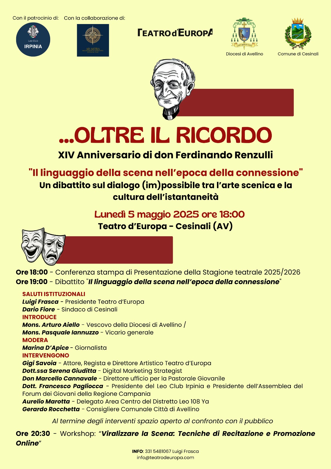 Lunedì 5 maggio, il Teatro d’Europa di Cesinali apre le sue porte per un evento speciale in occasione del XIV anniversario della scomparsa di Don Ferdinando Renzulli. Intitolata '…Oltre il Ricordo', la giornata si propone come un ponte tra memoria e futuro, unendo la figura del sacerdote fondatore alla riflessione su temi contemporanei legati al teatro e alla comunicazione.