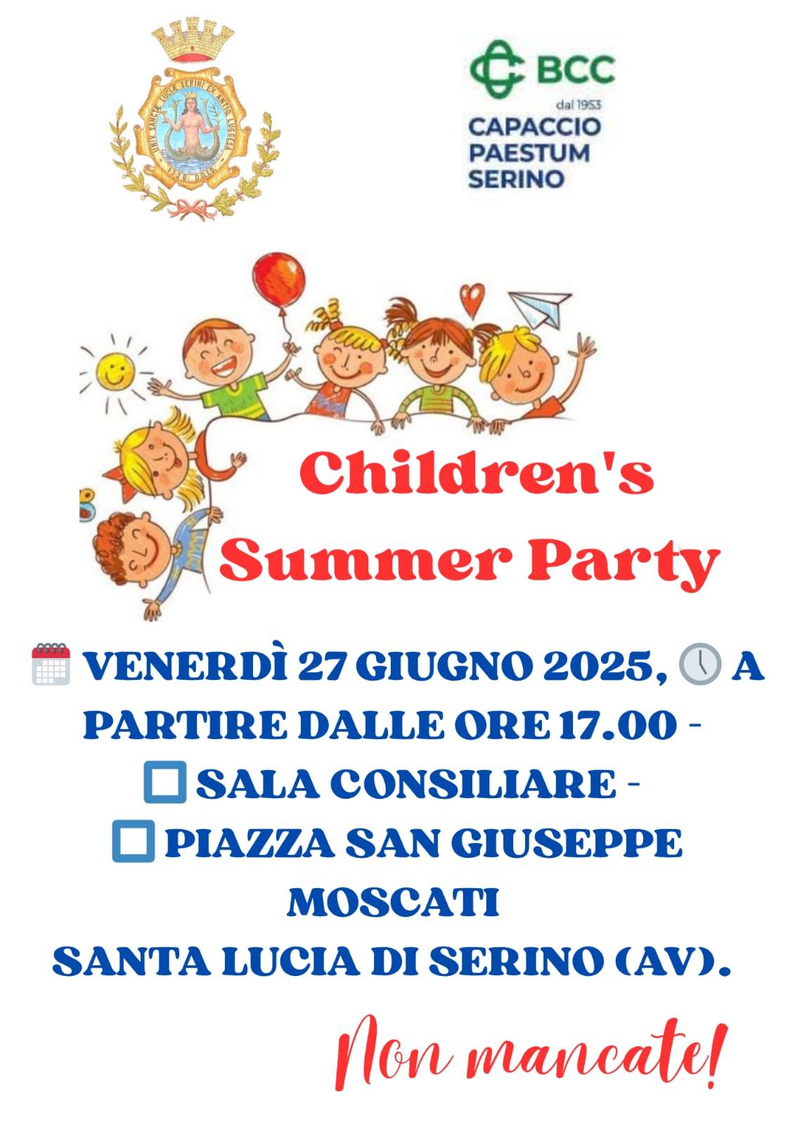 Il ‘Children’s Summer Party’ rappresenterà l’occasione per accogliere l’estate in un clima di festa. L’evento si svolgerà venerdì 27 giugno, a partire dalle ore 17.00, con ritrovo presso la Sala Consiliare di Santa Lucia di Serino, per assistere a uno spettacolo di micromagia a cura di 'Cappellaio Matto Animazione'.
