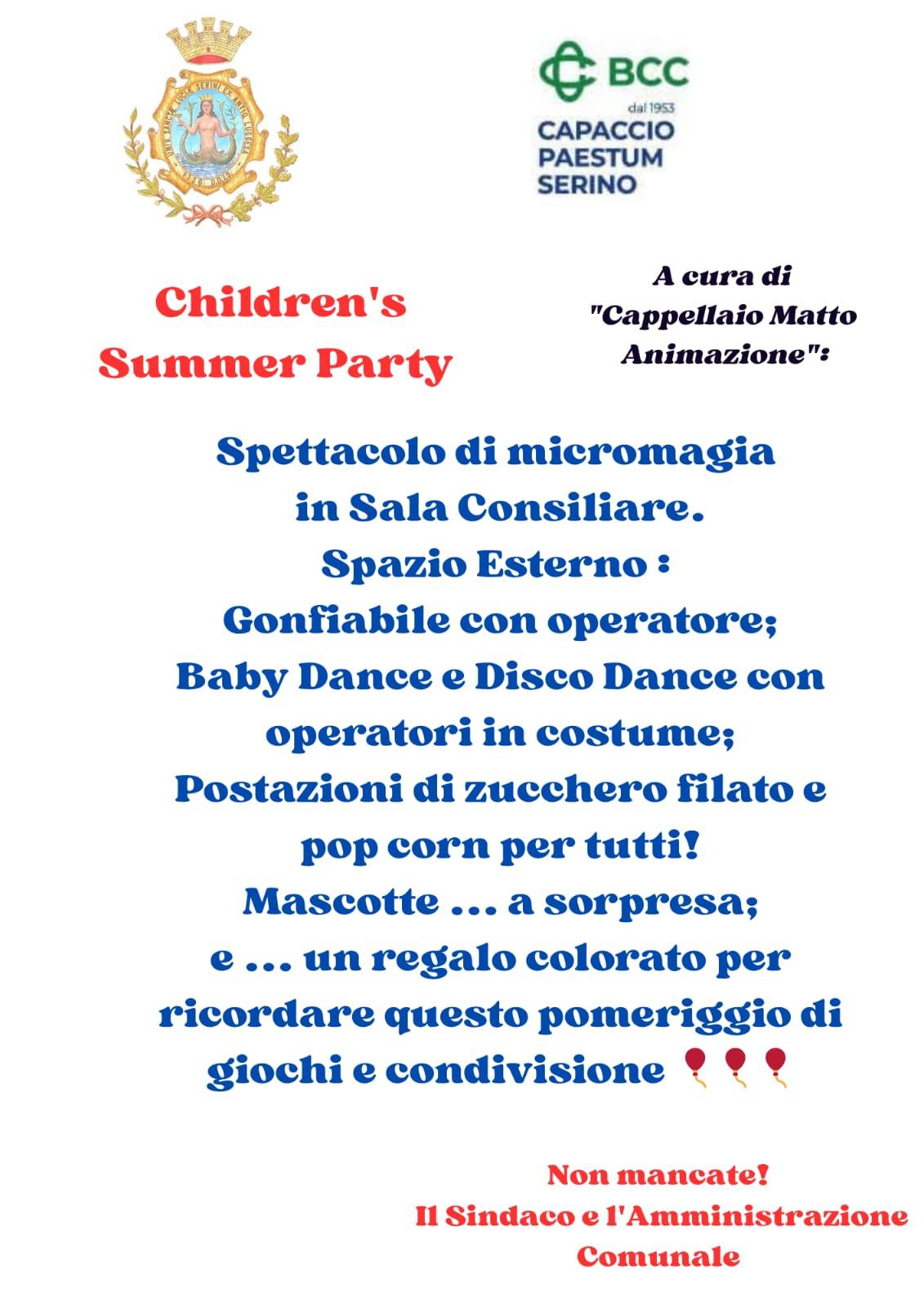 "Ogni bambino rappresenta un raggio di sole, e l’estate è il momento in cui può risplendere con maggiore intensità". I più piccoli portano luce, calore e gioia in ogni comunità, ed è proprio a loro che l’Amministrazione Comunale ha voluto dedicare un’iniziativa speciale. Con il supporto della BCC Capaccio Paestum Serino, è stato organizzato un pomeriggio all’insegna del gioco, della condivisione e dell’allegria, rivolto a bambini e bambine, ma anche agli adulti desiderosi di riscoprire lo spirito dell’infanzia.