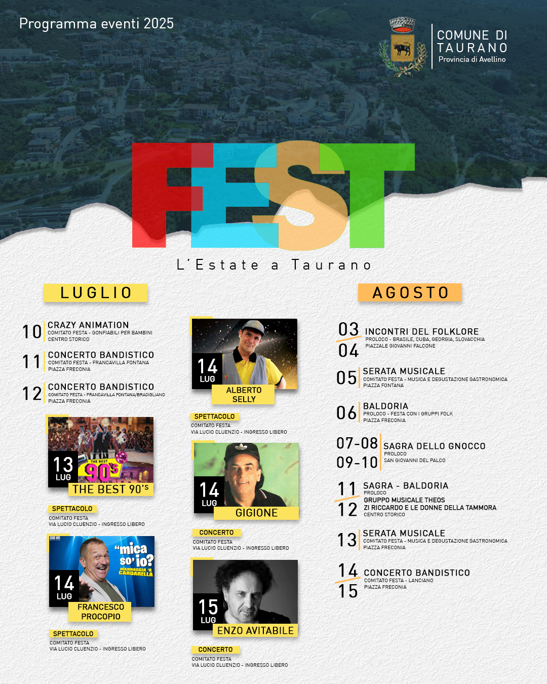 Prende il via "Fest", il ricco cartellone degli eventi estivi del Comune di Taurano, frutto del lavoro delle Istituzioni e delle Associazioni del territorio riunite in una rete di creatività e collaborazione.