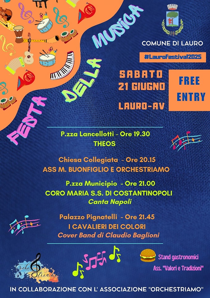 L'Assessorato alle Associazioni del Comune di Lauro, in collaborazione con l'Associazione "Orchestriamo", presenta la "Festa della Musica", una bella iniziativa inserita nel cartellone delle manifestazioni estive del "Lauro Festival 2025".