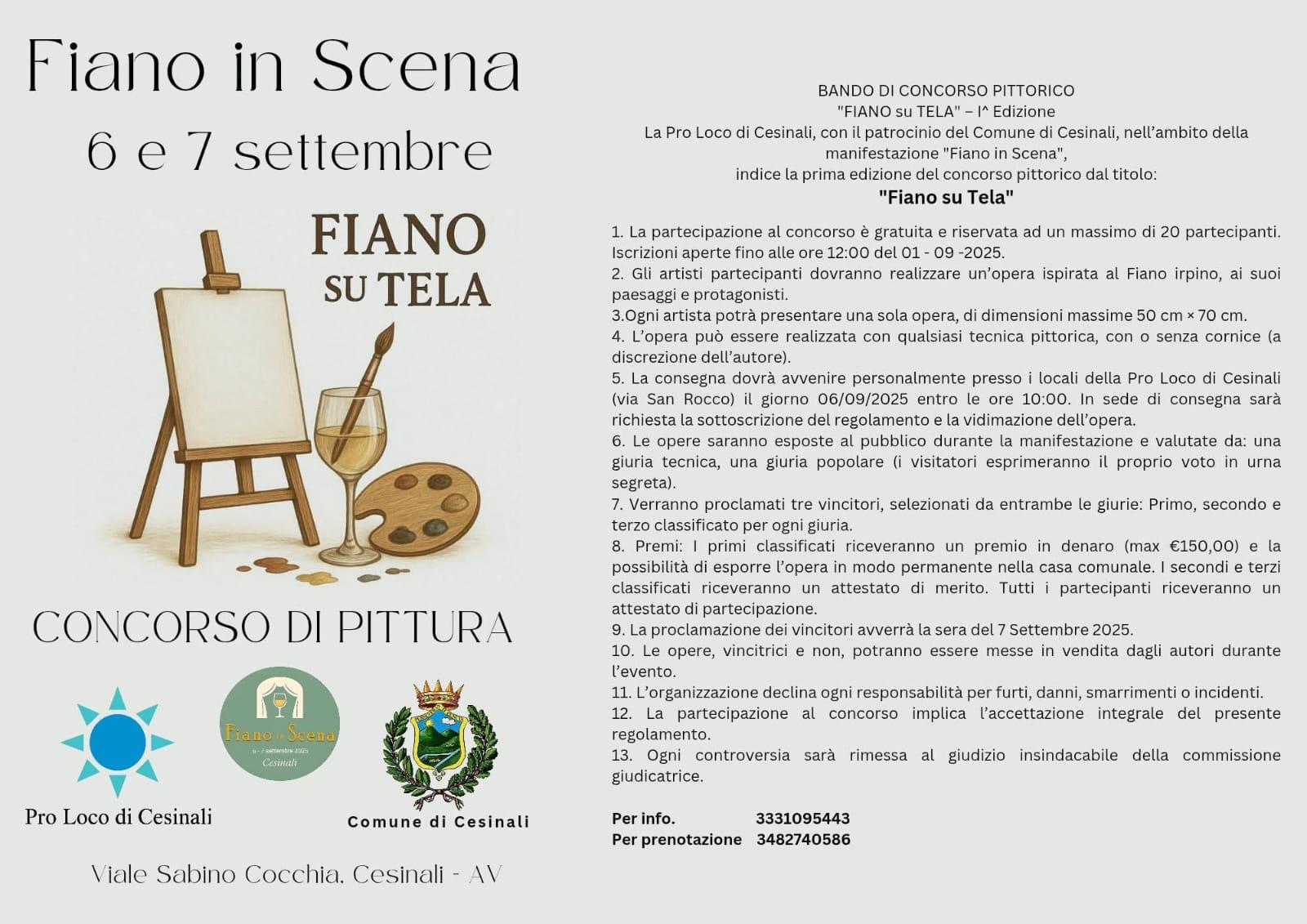 Sabato 6 e Domenica 7 sarà possibile partecipare alla prima edizione del concorso pittorico " Fiano su Tela" la cui iscrizione e' gratuita e aperta ad un massimo di 20 artisti. Nelle stesse giornate, chi vorra' approfondire la conoscenza del Fiano DOCG potrà vivere una passeggiata tridimensionale partecipando al Winestour dove tecnologia e arte racconteranno questo splendido territorio.