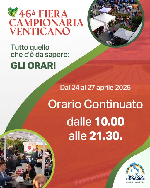 La 46ª Fiera Campionaria di Venticano si prepara ad accogliere espositori, visitatori e operatori del settore dal 24 al 27 aprile nel quartiere fieristico, con orario continuato dalle 10.00 alle 21.30, offrendo opportunità uniche per imprese e territori.