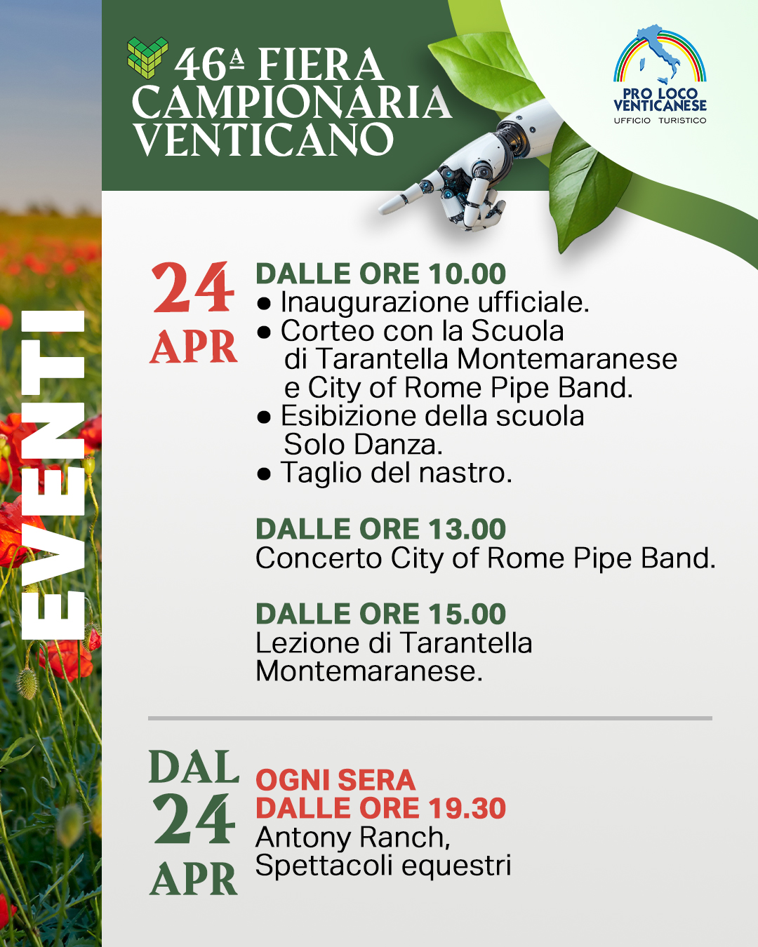 Il 24 aprile si parte dalle 10.00 con l’inaugurazione ufficiale, il corteo con la Scuola di Tarantella Montemaranese e la City of Rome Pipe Band, l’esibizione della scuola Solo Danza e il taglio del nastro. Alle 13.00 concerto della City of Rome Pipe Band e alle 15.00 lezione di tarantella.