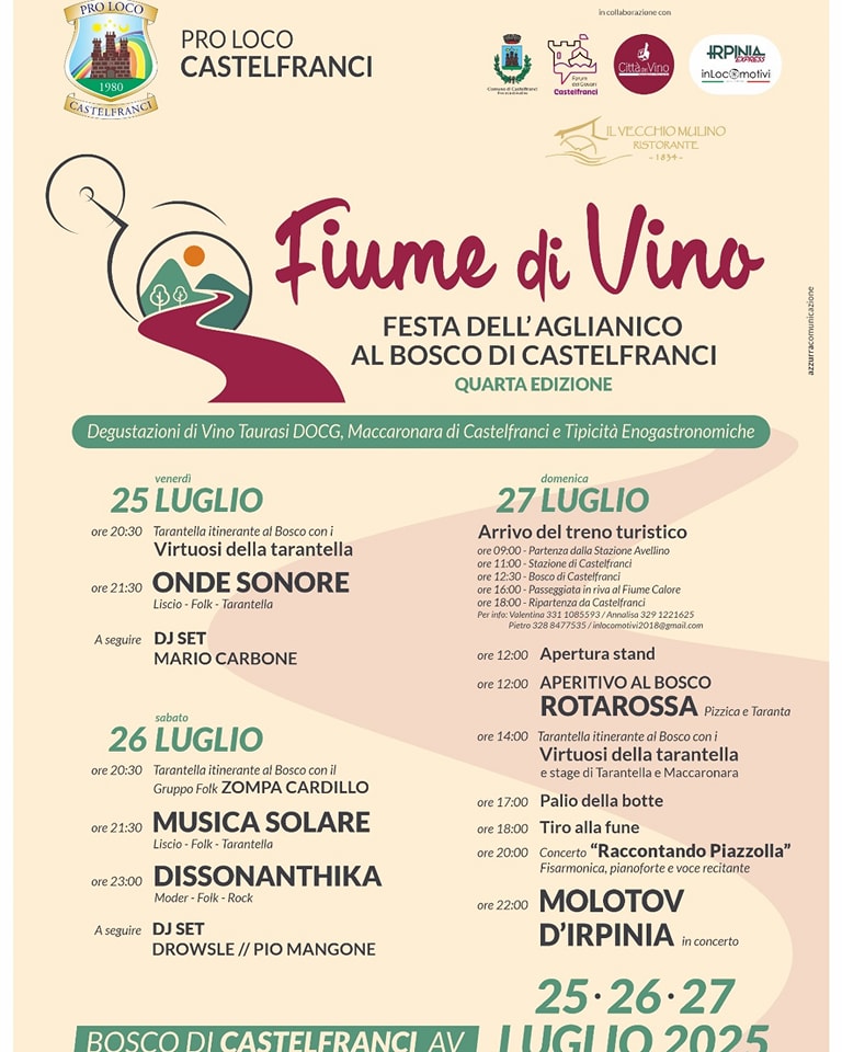 Castelfranci si prepara ad accogliere la quarta edizione di “Fiume di Vino”, la rinomata festa dedicata all’Aglianico che si terrà dal 25 al 27 luglio presso il Bosco di Castelfranci. L’evento organizzato dalla Pro Loco Castelfranci in collaborazione con diverse associazioni e realtà locali offrirà un’esperienza immersiva tra natura, musica e sapori tipici.
