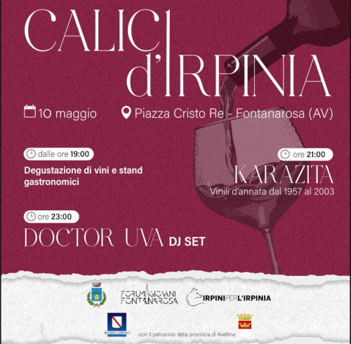 A Fontanarosa, Sabato 10 Maggio, evento dedicato ai vini irpini. Si comincerà alle ore 16.00, presso la Sala conferenze del Museo Civico, con "Vini d'Irpinia - passato, presente e futuro del vino in Irpinia". Si proseguirà, in Piazza Cristo Re, con "Calici d'Irpinia", degustazione di vini, stand gastronomici e tanta bella musica a partire dalle ore 19.00. Sarà un'opportunità unica per scoprire e apprezzare le eccellenze del nostro territorio.