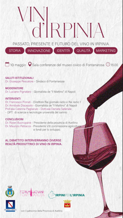 "Vini d'Irpinia - passato, presente e futuro del vino in Irpinia", un dibattito, in cui interverranno diverse realtà produttrici di vino in Irpinia, tra storia, innovazione, identità, qualità e marketing.
