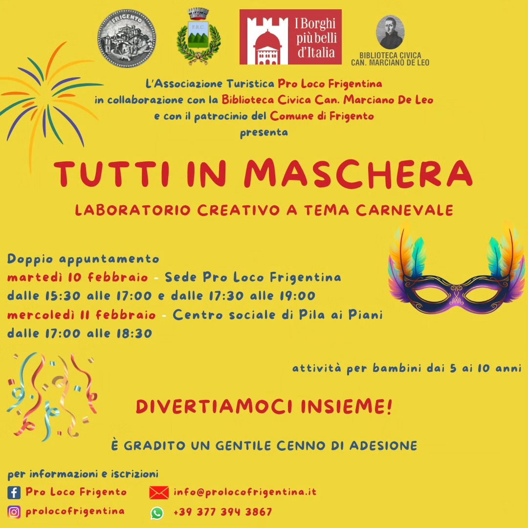 Frigento si prepara a vivere il Carnevale all’insegna della creatività e del divertimento con “Tutti in maschera”, il laboratorio creativo a tema carnevalesco promosso dall’Associazione Turistica Pro Loco Frigentina, in collaborazione con la Biblioteca Civica “Can. Marciano De Leo” e con il patrocinio del Comune di Frigento.