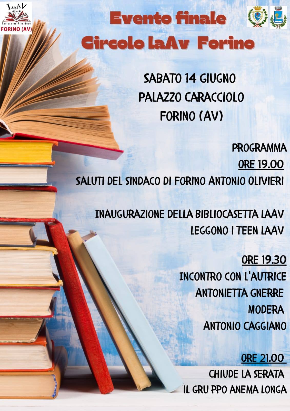 Sabato 14 giugno, a partire dalle ore 19.00, con il patrocinio dei comuni di Forino e Contrada, si concluderà la prima stagione del Circolo LaAV: 'Letture ad Alta Voce di Forino'. L’evento finale si aprirà nella villa comunale di Forino con la consegna ufficiale alla comunità della Bibliocasetta LaAV, un simbolo concreto dell’impegno per la promozione della lettura condivisa.