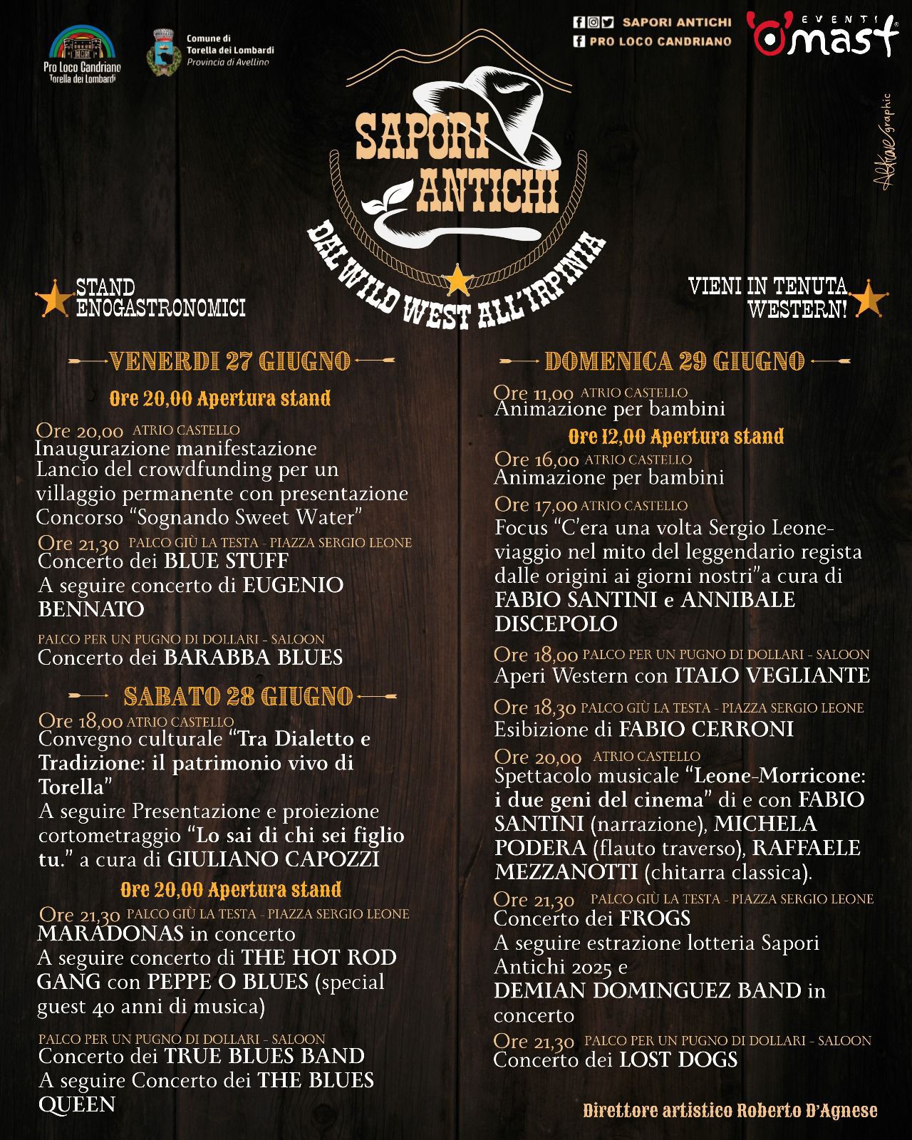 In onore del grande Sergio Leone, Torella dei Lombardi ospiterà tre giorni di musica dal vivo, spettacoli in stile cowboy, degustazioni di prodotti tipici e atmosfere cinematografiche, trasportando i visitatori in un viaggio nel tempo tra praterie immaginarie e sapori reali con "Sapori Antichi 2025".