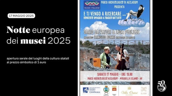 Per l'occasione, a Mirabella Eclano, con l'organizzazione del Parco Archeologico Antica Città di Aeclanum e presso il sito del centro del Calore, Luca Pugliese & Dario Salvatori in "E ti vengo a ricercare…", concerto omaggio a Franco Battiato, a quattro anni dalla sua scomparsa. Introduce Francesco Pionati (dir. Radio Rai Uno). Appuntamento per Sabato 17 Maggio alle ore 19.00.