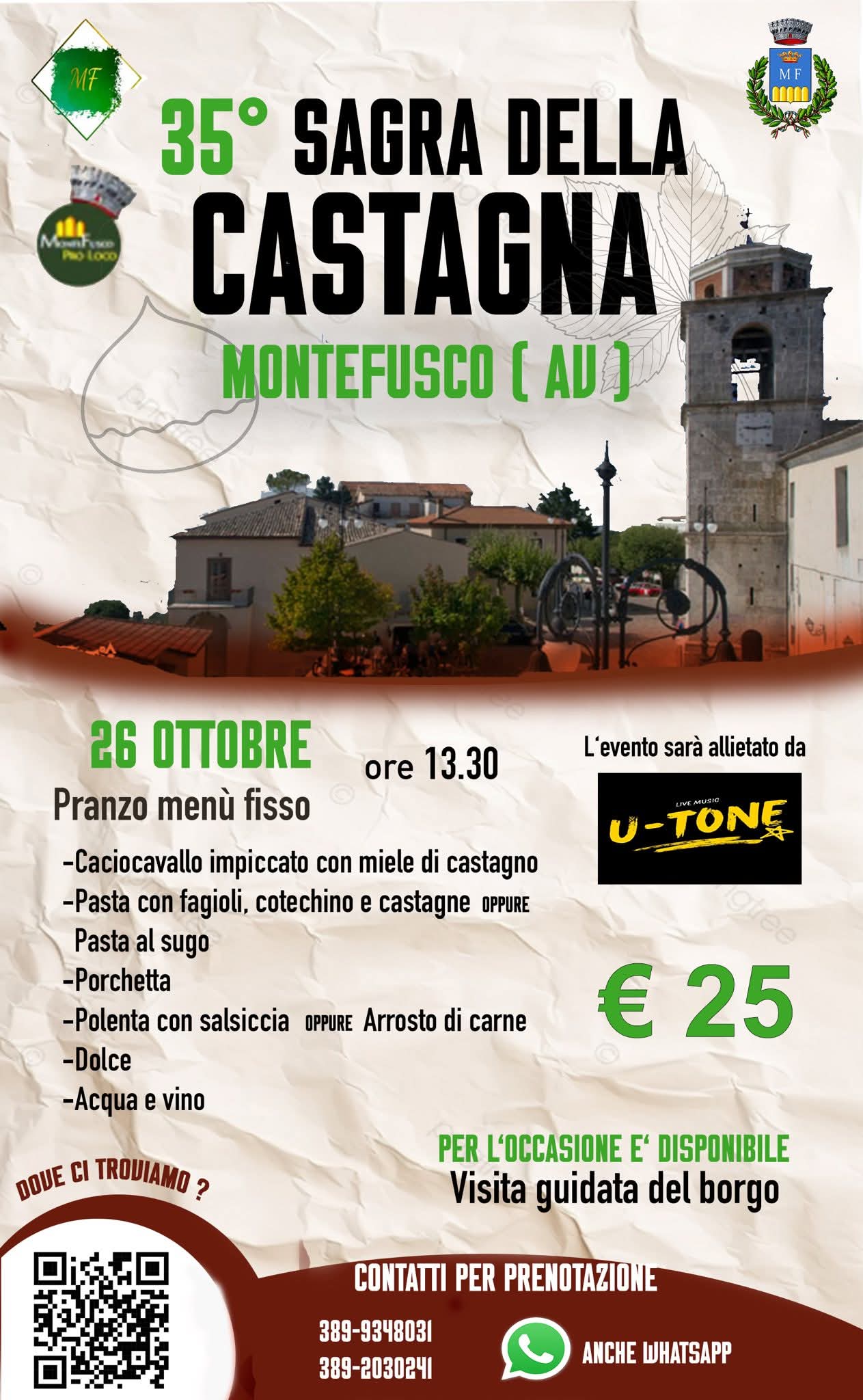 Il programma prevede l’apertura della sagra venerdì 24 ottobre alle ore 19:30, con l’intrattenimento musicale del gruppo “I Malamente” e DJ set. Sabato 25 ottobre, sempre dalle 19:30, la serata sarà animata dal gruppo “Amba Aradam”, accompagnato da balli e atmosfere popolari. Domenica 26 ottobre, la giornata conclusiva, inizierà alle ore 12:00 con l’esibizione live del duo “U-Tone”.