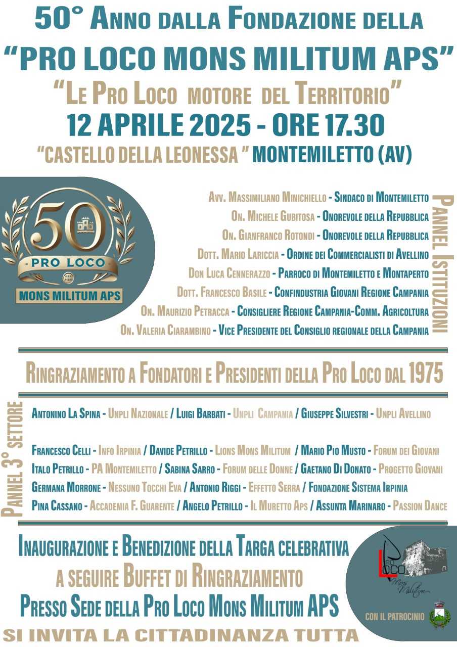 Sabato 12 aprile alle ore 17:30, presso il suggestivo Castello della Leonessa a Montemiletto, si terrà la celebrazione del 50° anniversario della fondazione della Pro Loco 'Mons Militum APS', un evento dal titolo 'Le Pro Loco motore del Territorio' che renderà omaggio a mezzo secolo di impegno, cultura e identità locale.