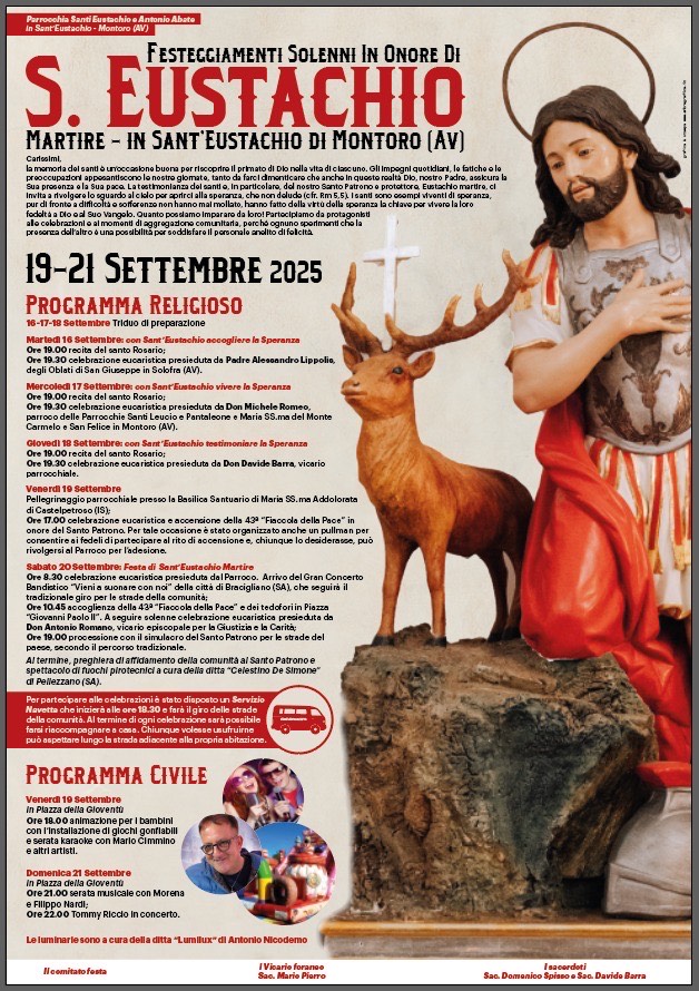 Fervono i preparativi per i Solenni Festeggiamenti in onore di Sant'Eustachio Martire, promossi dalla Parrocchia Santi Eustachio e Antonio Abate di Sant'Eustachio di Montoro.