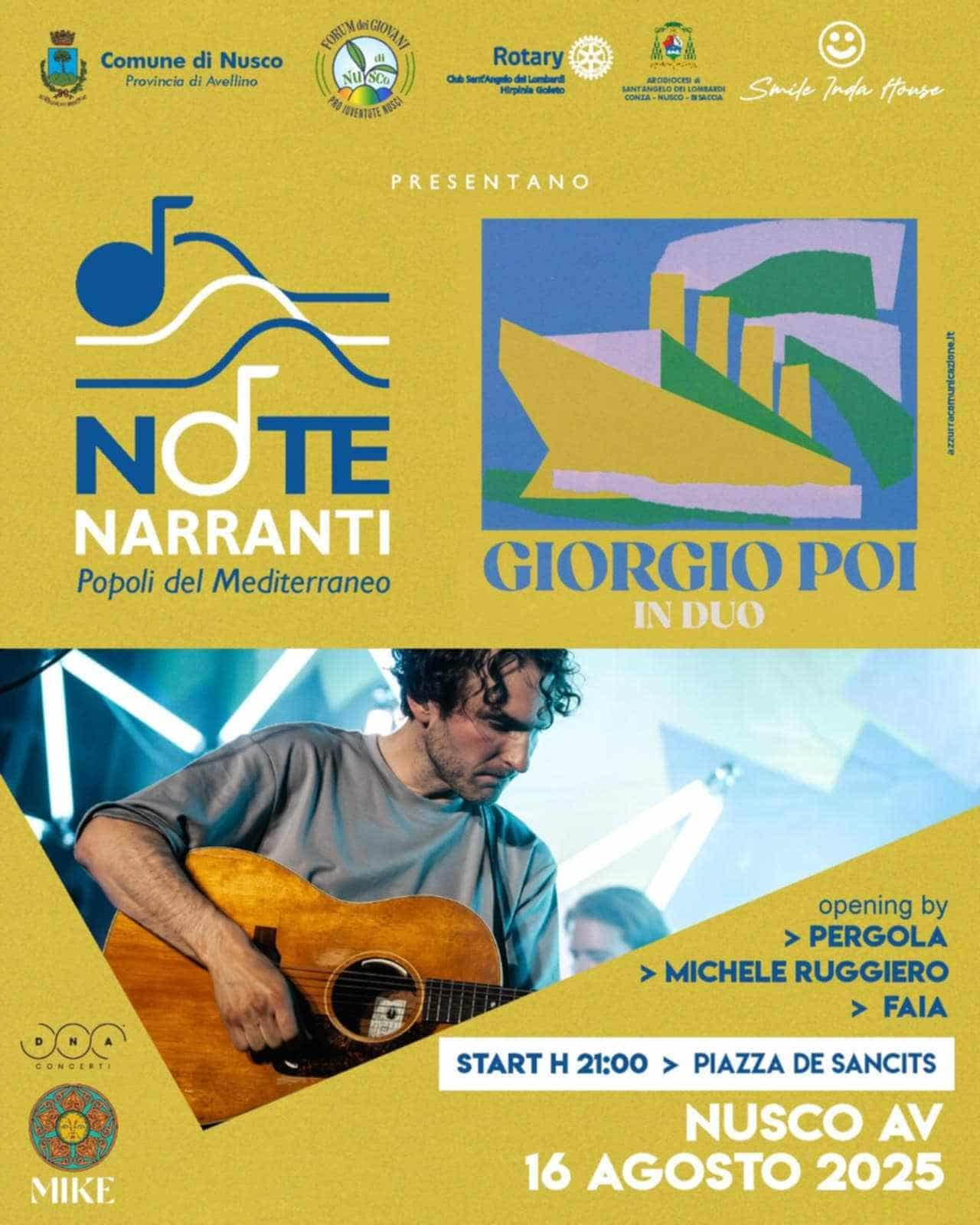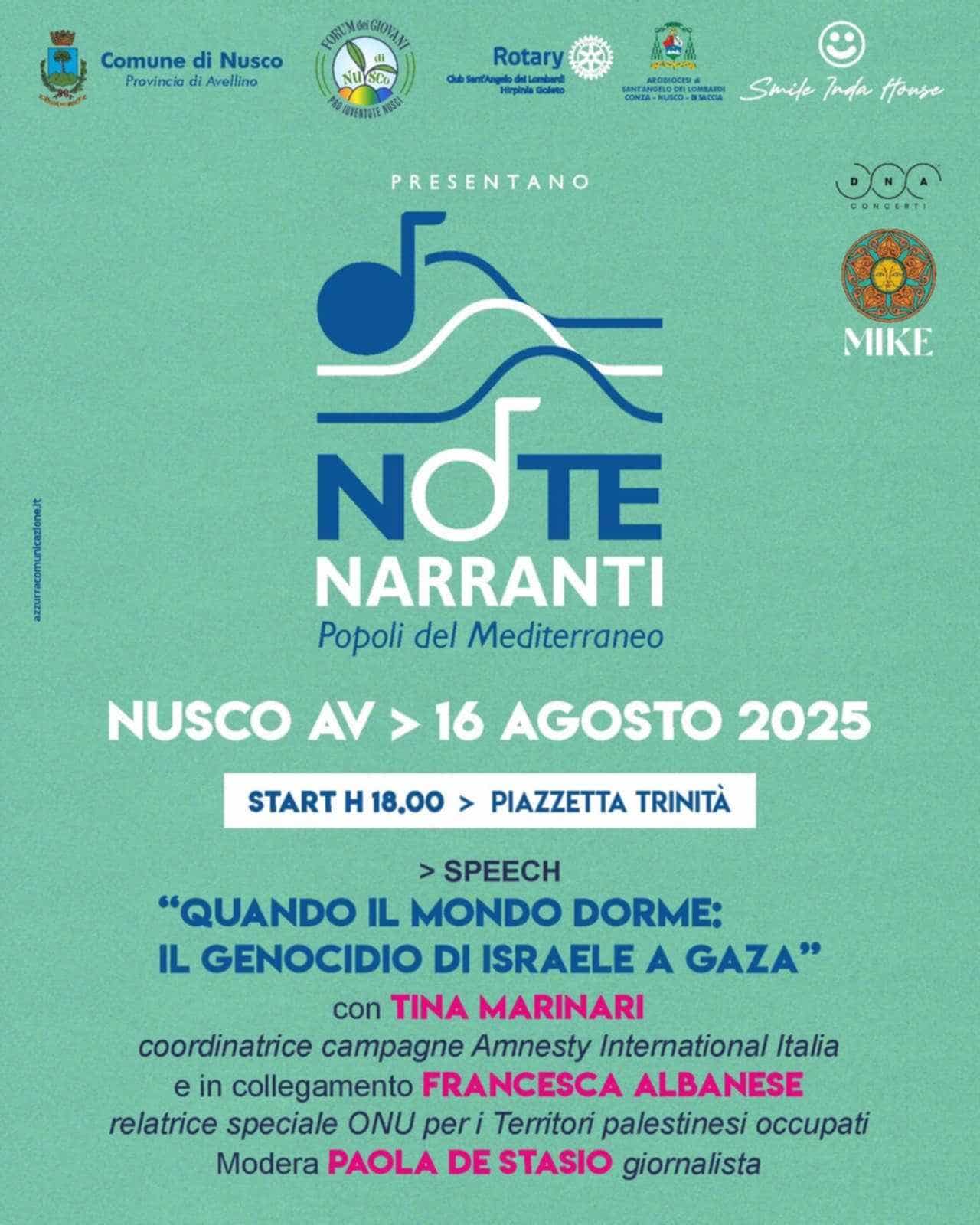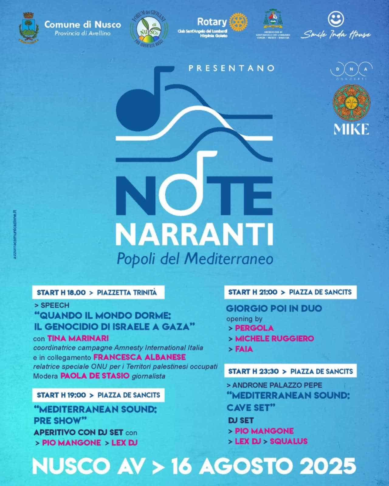 Dopo il successo dell’edizione 2024, “Note Narranti – nel segno dell’inclusività e della cooperazione tra popoli” torna a Nusco, il 16 agosto, in una forma rinnovata e più ambiziosa: un festival, interamente, dedicato alla musica, alla letteratura, ma anche alla solidarietà e al dialogo tra i “popoli del Mediterraneo”.
