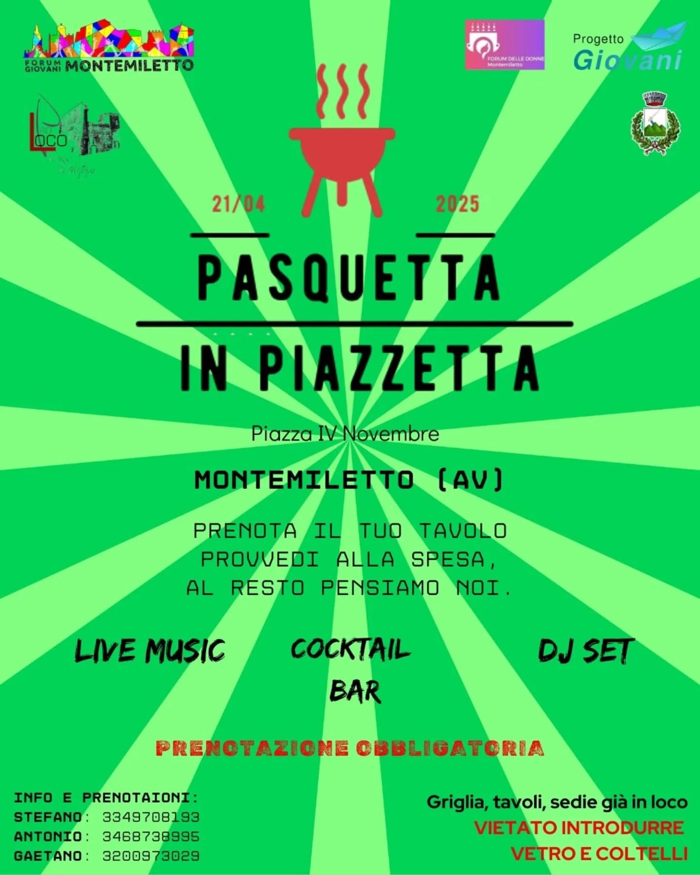 Griglie, legna, tavoli e sedie saranno già disponibili sul posto ma è severamente vietato introdurre vetro e coltelli.
