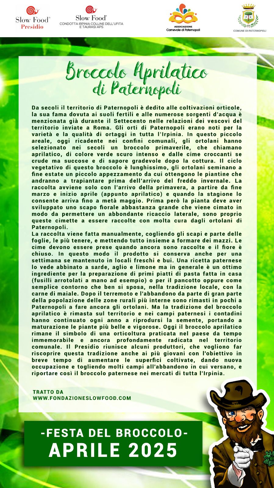 Il 25 e 26 aprile, Paternopoli si prepara ad accogliere la Festa del Broccolo Aprilatico, un appuntamento attesissimo che celebra uno dei simboli più autentici della tradizione gastronomica irpina. Protagonista indiscusso dell’evento è appunto, il Broccolo Aprilatico, ortaggio raro e prezioso, noto per il suo colore verde intenso, il gusto dolce con una punta di amaro e una consistenza che resta croccante anche dopo la cottura. Il nome stesso richiama il mese di aprile, quando raggiunge la sua maturazione ideale, diventando ingrediente principe della cucina locale.