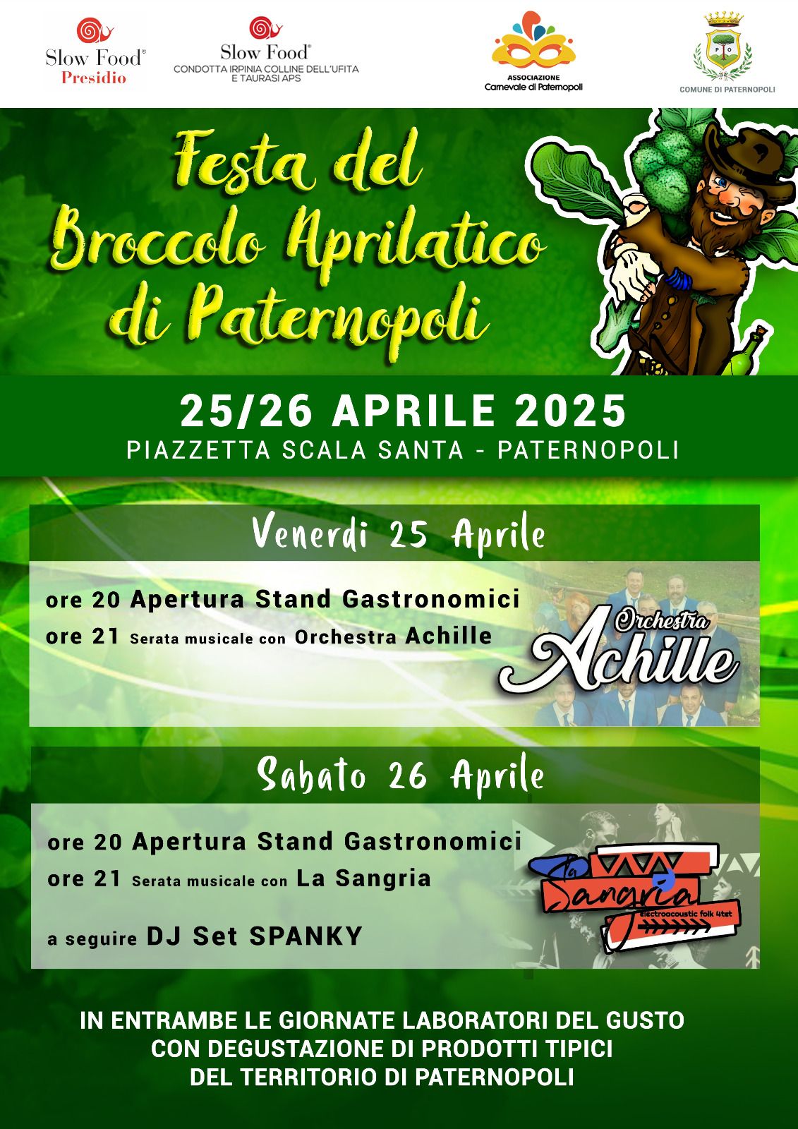 Durante la manifestazione, le vie di Paternopoli si animeranno con stand gastronomici pronti a deliziare i visitatori con ricette tipiche a base di broccolo, preparate secondo antiche tradizioni. Non mancheranno i laboratori del gusto, veri e propri momenti di scoperta, in cui esperti e appassionati sveleranno segreti e tecniche per valorizzare questo ortaggio in cucina. Il tutto sarà accompagnato da musica dal vivo e momenti di intrattenimento che renderanno l’esperienza ancora più coinvolgente. Venerdì 25 aprile l’apertura degli stand è prevista alle ore 20.00, seguita alle 21.00 dall’esibizione dell’Orchestra Achille. Sabato 26 aprile, alla stessa ora, sarà la volta del gruppo La Sangria, con un DJ set di Spanky a chiudere la serata. In entrambe le giornate, spazio anche ai laboratori del gusto con degustazione di prodotti tipici del territorio.