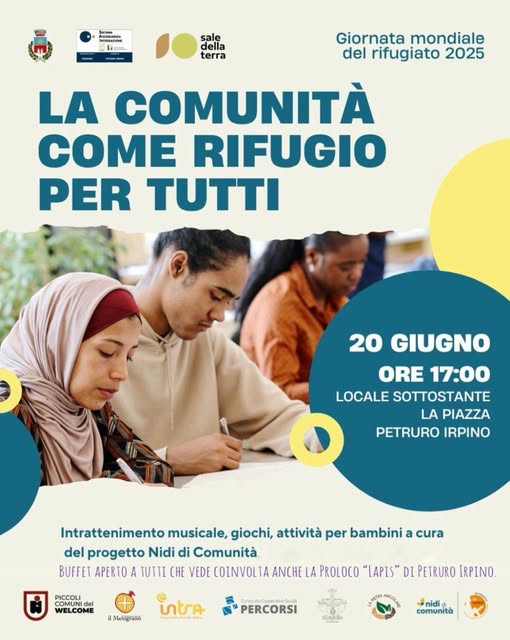 Venerdì 20 giugno, il Sai di Petruro Irpino insieme all' ampliamento di Avellino , Atripalda e Montoro festeggia la "Giornata mondiale del rifugiato" con la partecipazione di: Nidi di comunità Pro Loco Lapis Petruro Irpino  Comune di Petruro Irpino Intra Cooperativa Sociale Onlus Piccoli Comuni del Welcome Consorzio Percorsi .
