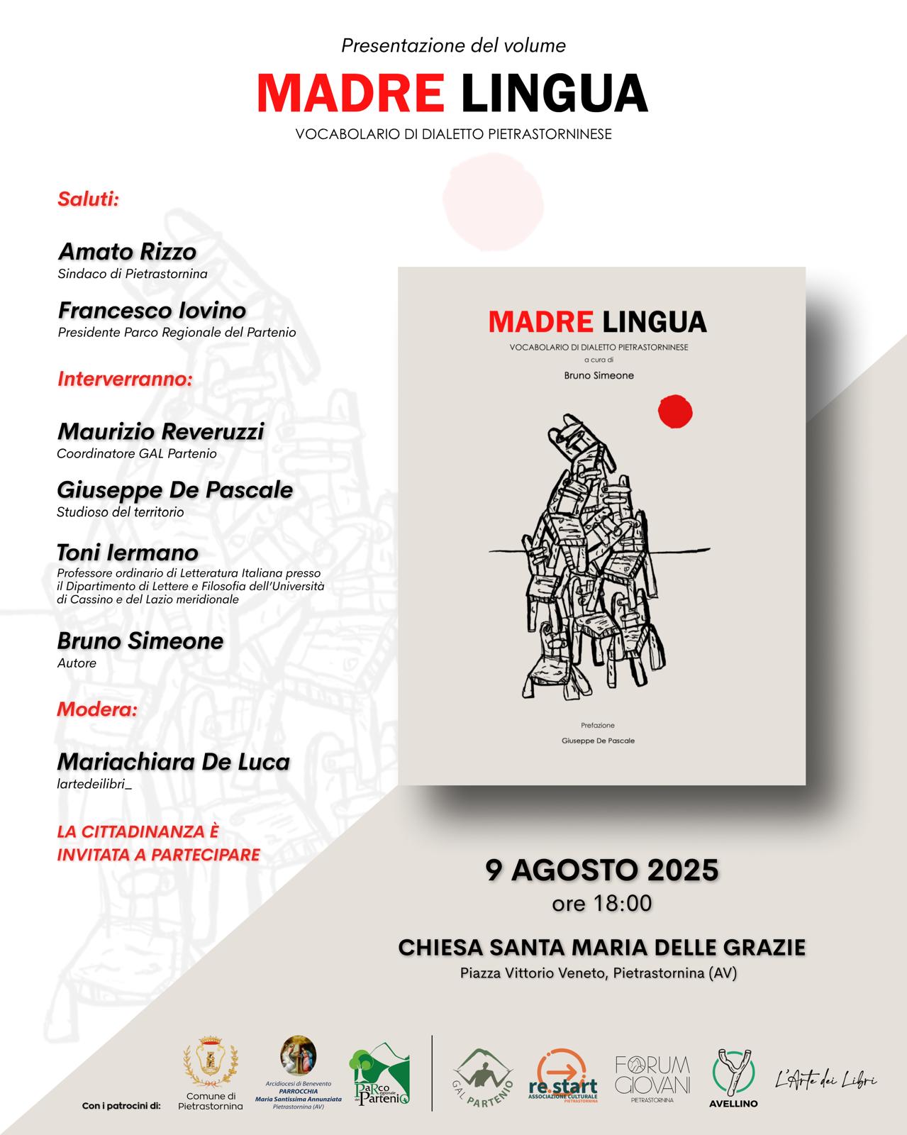 “Madre Lingua" sarà presentato sabato 9 agosto, alle ore 18.00, presso la chiesa S. Maria delle Grazie di Pietrastornina. L'evento organizzato in collaborazione tra il G.A.L. Partenio, l'associazione "Restart" e il Forum Giovani di Pietrastornina vedrà intervenire il sindaco di Pietrastornina Amato Rizzo, il presidente del Parco Regionale del Partenio Francesco Iovino, Maurizio Reveruzzi, coordinatore del G.A.L. Partenio, Toni Iermano, professore ordinario di Letteratura italiana presso il Dipartimento di Lettere e Filosofia dell'Università degli Studi di Cassino e del Lazio meridionale e Giuseppe De Pascale, studioso del territorio. A moderare l'incontro sarà Mariachiara De Luca, responsabile e creatrice della pagina Instagram “lartedeilibri”.
