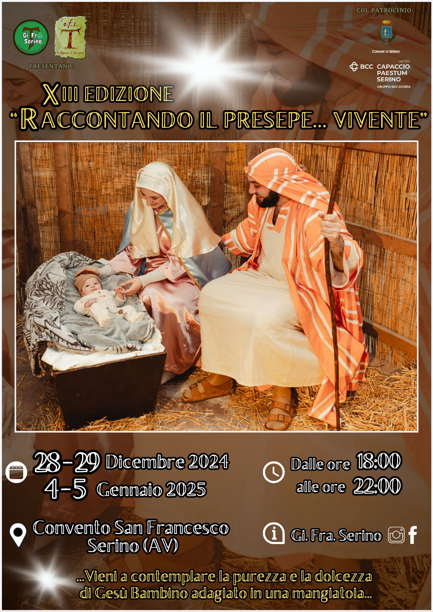 Nei giorni 28 e 29 dicembre 2024 e 4 e 5 gennaio 2025, dalle 18.00 alle 22.00, il suggestivo Convento di San Francesco a Serino, in provincia di Avellino, farà da cornice al tradizionale evento. Figuranti in abiti d’epoca condurranno i visitatori in un viaggio tra tradizioni e mestieri antichi.
