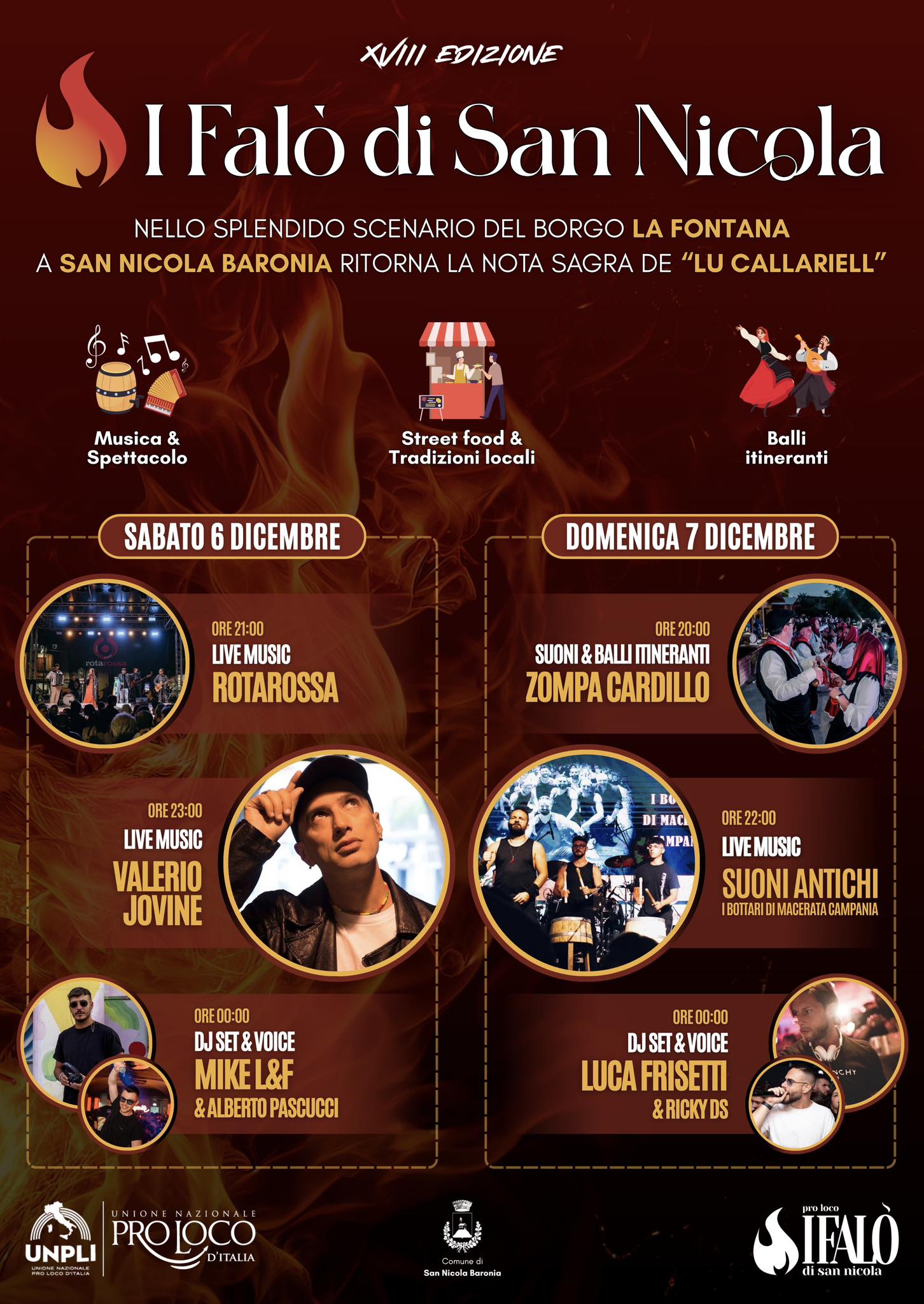 Anche quest’anno la manifestazione promette di offrire due serate all’insegna della convivialità, della cultura e della musica, confermando “I Falò di San Nicola” come una delle tradizioni più sentite e amate della comunità baroniese.