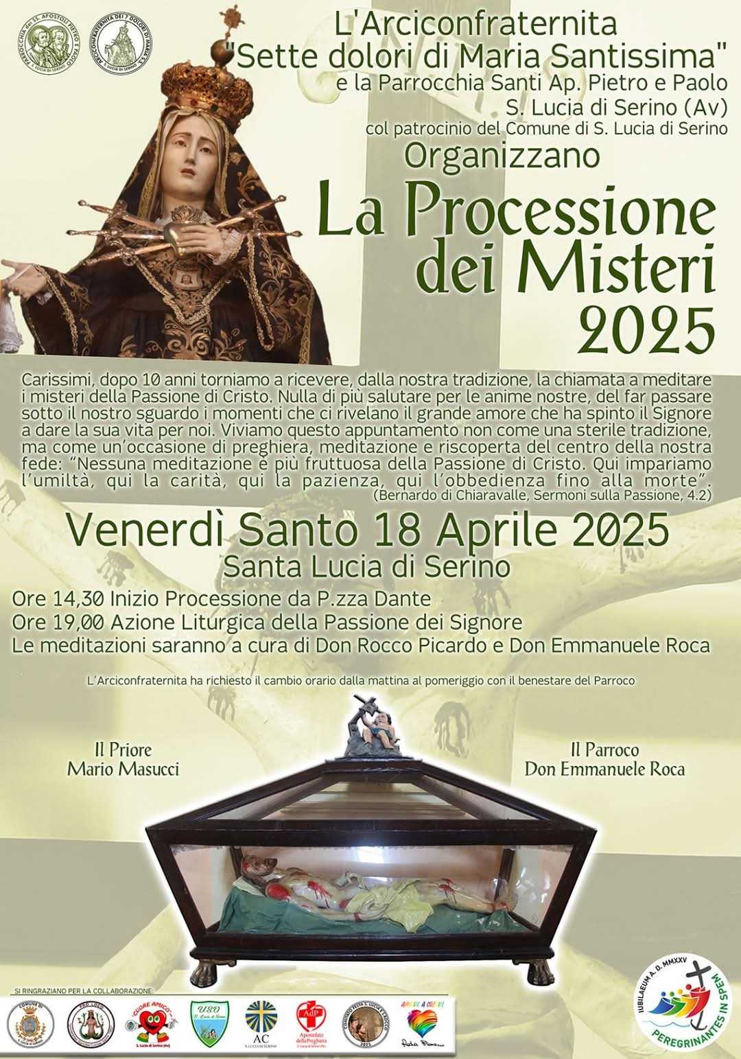 L’Arciconfraternita dei Sette Dolori di Maria Santissima e la Parrocchia dei Santi Apostoli Pietro e Paolo di Santa Lucia di Serino, con il Patrocinio del Comune di Santa Lucia di Serino e la collaborazione di vari Enti ed Associazioni del territorio, organizzano la Processione dei Misteri 2025.