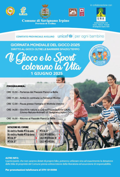 In occasione della Giornata mondiale del gioco 2025, appuntamento a Savignano Irpino, Domenica 1° Giugno, con "Il Gioco e lo Sport colorano la Vita". Il messaggio è forte e chiaro, "diritto al gioco: oltre le barriere spazio/tempo". L'iniziativa, che vedrà protagoniste assolute le bici e i giochi in natura, prenderà il via alle ore 10.30.