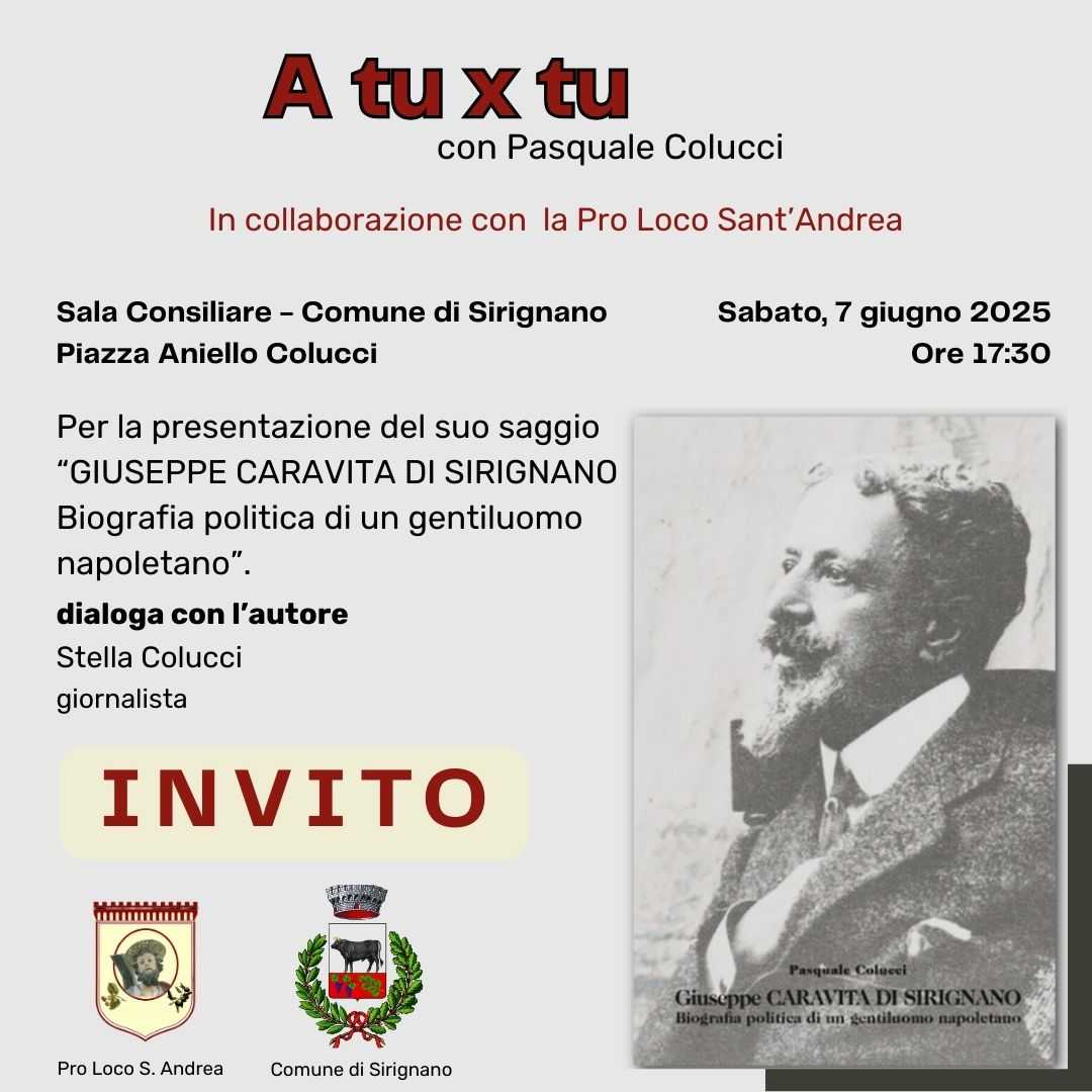 Sabato 7 Giugno, l'autore presenterà "Giuseppe Caravita di Sirignano. Biografia politica di un gentiluomo napoletano", saggio storico sulla figura del principe Giuseppe Caravita, un gentiluomo di fine Ottocento che diede un impulso di rinnovamento e prosperità a Sirignano e all'intera area del Baianese.