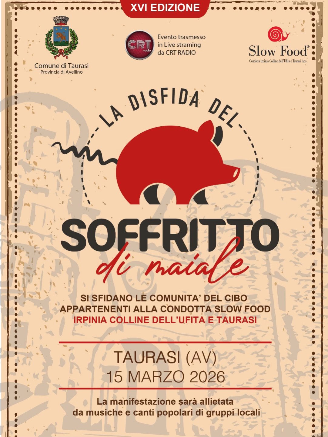 Il cuore dell’Irpinia torna a battere al ritmo della tradizione gastronomica con uno degli appuntamenti più attesi dell’anno. Domenica 15 marzo 2026 il centro storico di Taurasi ospiterà la XVI edizione della Disfida del Soffritto di Maiale, la manifestazione enogastronomica che celebra uno dei piatti più identitari della cucina contadina irpina.